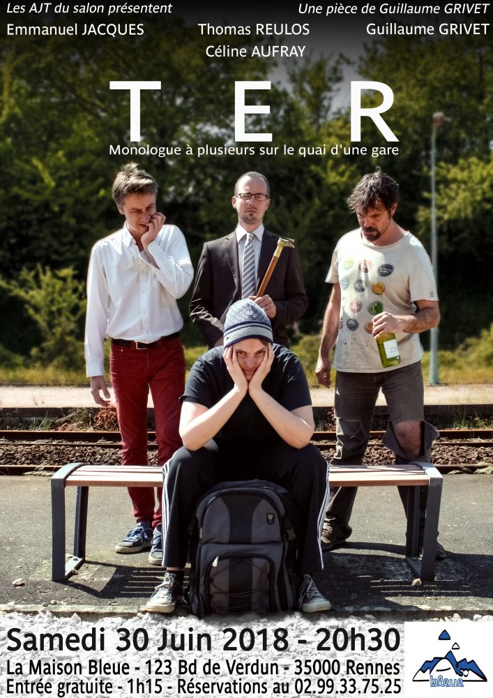 Représentation de la pièce “TER” Durée : 1h15 Avec : Emmanuel Jacques Thomas Reulos Guillaume Grivet Céline Aufray Pour plus d’informations, n’hésitez pas à consulter l’article : http://lamaisonbleuerennes.fr/theatre-t-e-r-de-guillaume-grivet