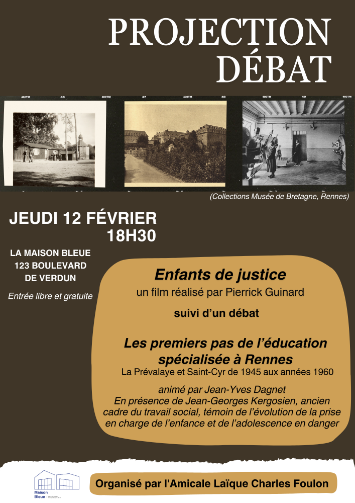 Le film sera suivi d’un débat “Les premiers pas de l’éducation spécialisée à Rennes”. La Prévalaye et St-Cyr de 1945 à 1960 animé par Jean-Yves Dagnet.