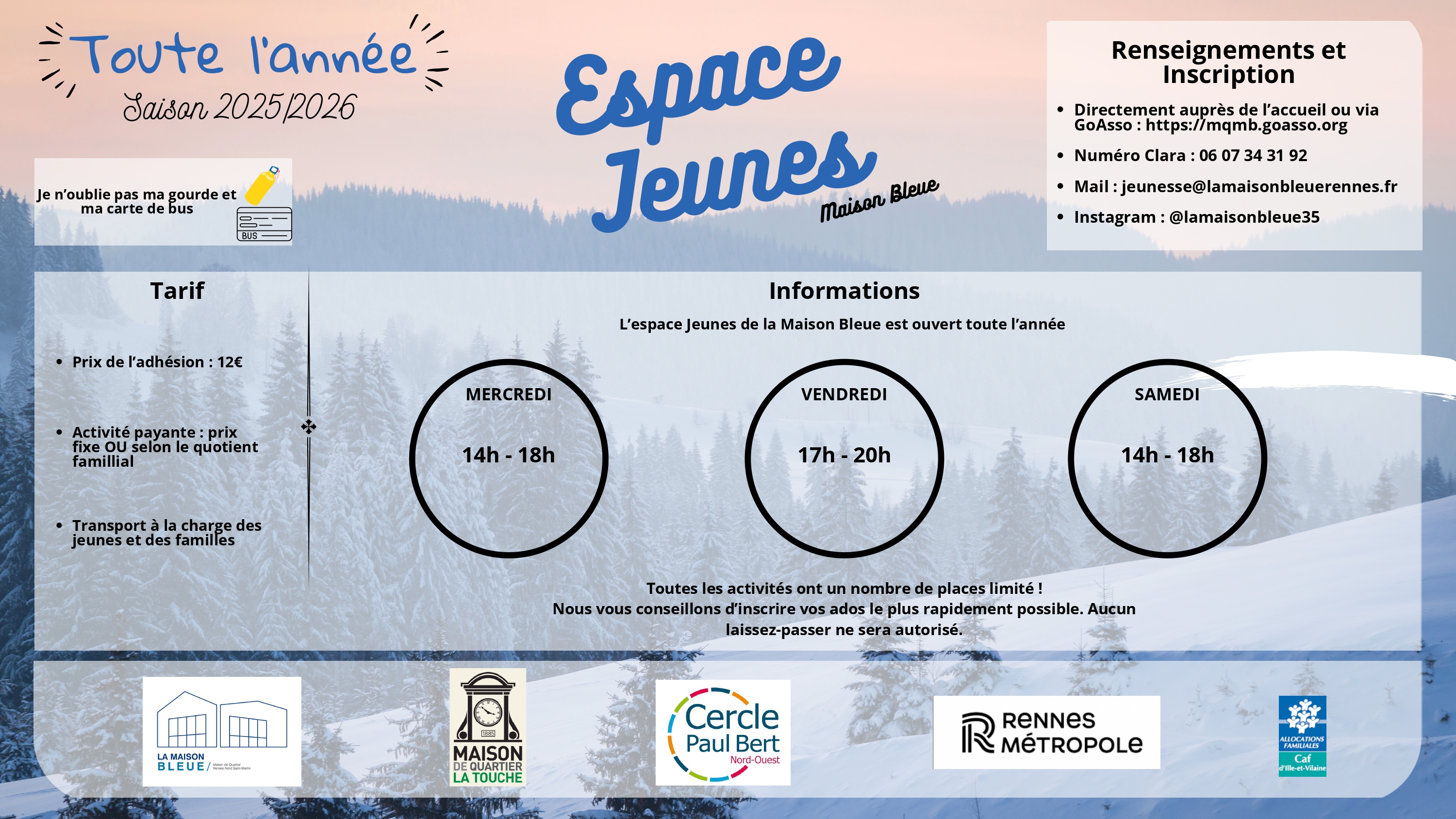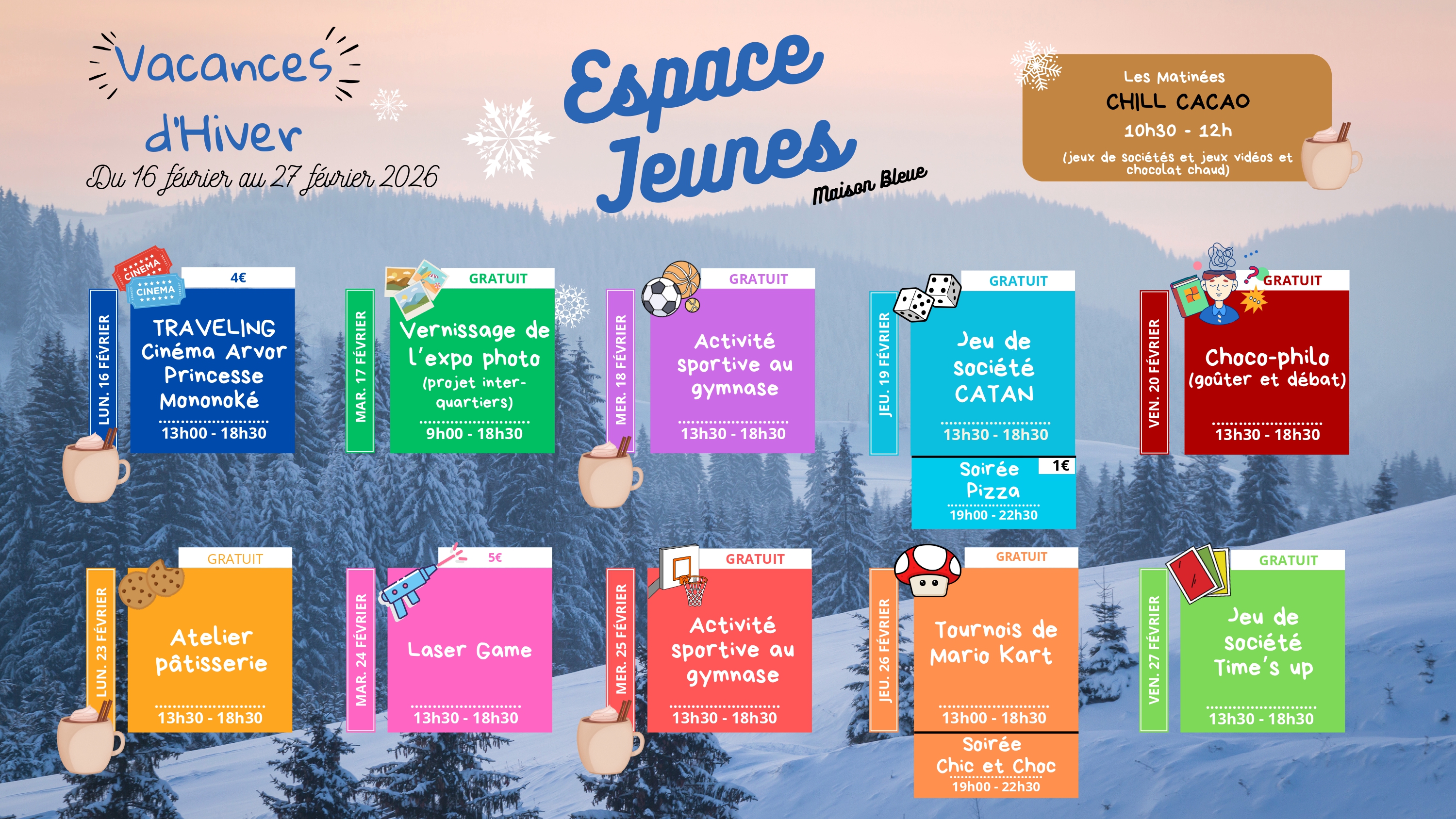 du 16 au 27 février 2026Inscriptions à l’accueil de la Maison Bleue ou via GOasso à partir du lundi 26 janvier 14h.