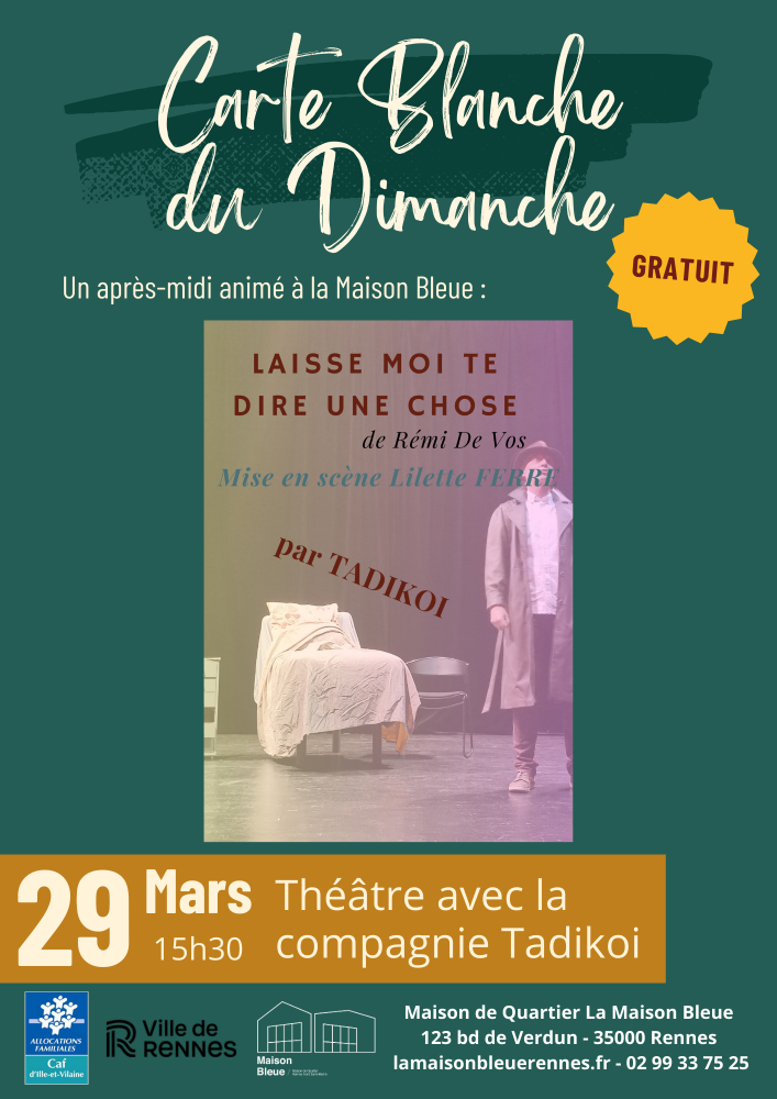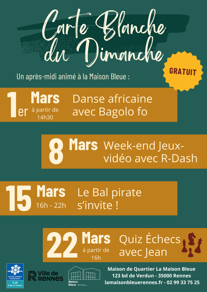 février 26, 2026février 26, 2026 AdminActualité, EvènementsBal Pirate, Danse, Echecs, jeux-vidéo, La Carte Blanche du Dimanche, La Maison Bleue, Théâtre Chaque dimanche de mars 2026 Un après-midi animé à la Maison Bleue Gratuit